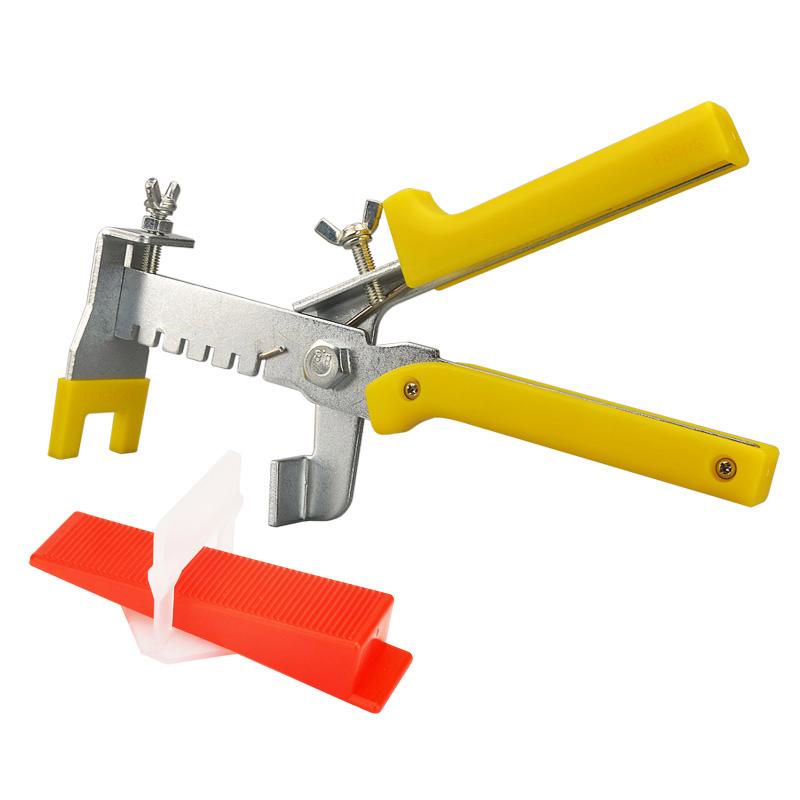 11、比如厨卫墙面如果客厅地面也要用这种方式贴砖的话,要先做地面找平误差小于5mm,再用瓷砖胶铺贴透明的卡子决定留缝宽度,买的时候要标注比如留缝2mm就只能买2mm这种规格的卡子用后会断在里面,不能重复利用红色的销子和卡钳可重复使用自己搜“瓷砖找平器”就可以找到。